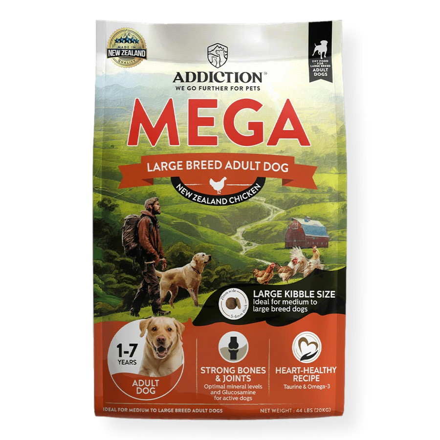 Big dogs have different needs at every stage of life. Fuel your big dog’s adventures with MEGA Chicken Large Breed Adult Dog Food, ideal for medium to large breed dogs ages 1-7 years old. This premium, complete and balanced lifestage dog food, designed by animal nutritionists, keeps your big dog at peak performance with the optimal levels of protein, fat, carbohydrates, minerals, and natural energy-boosting ingredients. With Addiction MEGA Chicken Large Breed Adult Food, your big dog can truly live its biggest life!