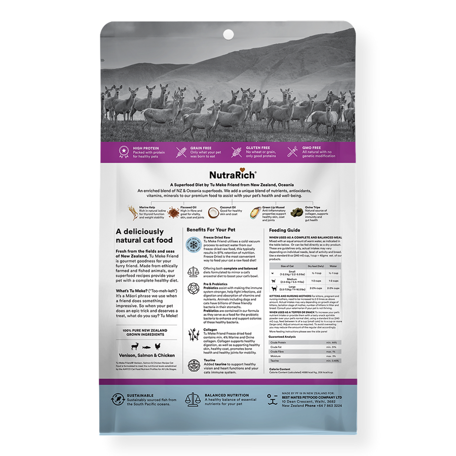 Tu Meke Friend Freeze Dried Venison, Salmon, & Chicken Raw Cat Food 280g - Your cat will love this! Tu Meke's lean, grass-fed venison provides quality protein, iron and essential B vitamins. Salmon and Chicken add nutrients that aid healthy joint function, reduce allergies and inflammation, and boost skin, coat and muscle health, as well as cardiovascular health and immunity.